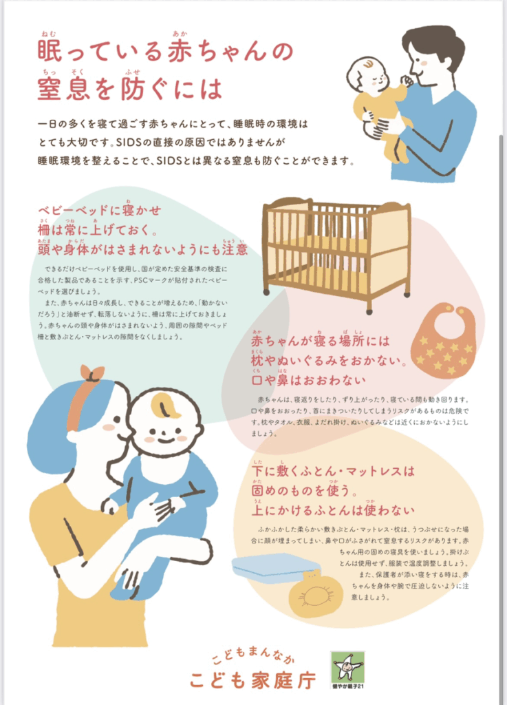 窒息を防ぐためにには、睡眠時の環境がとても大切ですのでリーフレットをご確認ください。